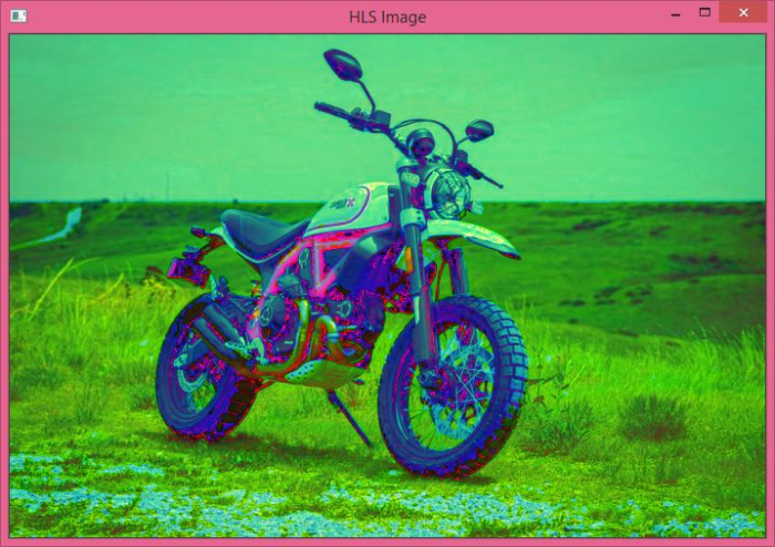 # import required libraries import cv2 # read RGB image, the input image is in BGR format img_bgr = cv2.imread('bike.jpg') # convert the BGR image to HLS img_hls = cv2.cvtColor(img_bgr, cv2.COLOR_BGR2HLS) # Display the converted HLS image cv2.imshow('HLS Image', img_hls) cv2.waitKey(0) cv2.destroyAllWindows()