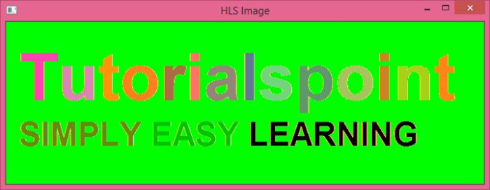 import cv2 # read RGB image, the image is in BGR format img = cv2.imread('tutpoint.png') # convert the BGR image to HLS img_hls = cv2.cvtColor(img, cv2.COLOR_BGR2HLS) # Display the converted HLS image cv2.imshow('HLS Image', img_hls) cv2.waitKey(0) cv2.destroyAllWindows()