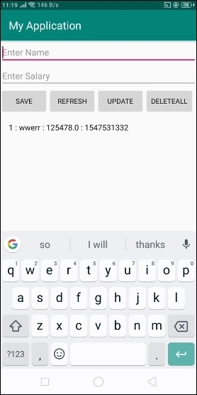 In the above code, we have taken name and salary as Edit text, when user click on save button it will store the data into sqlite data base. Click on refresh button to get the changes of the listview.