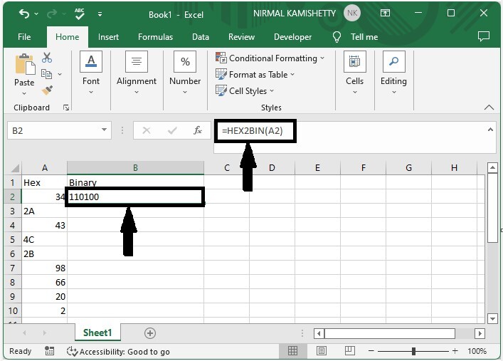 We can use the formula =BIN2HEX(A2) to convert a binary number to a hex number .In the formula, A2 is the address of our value in the Excel sheet.