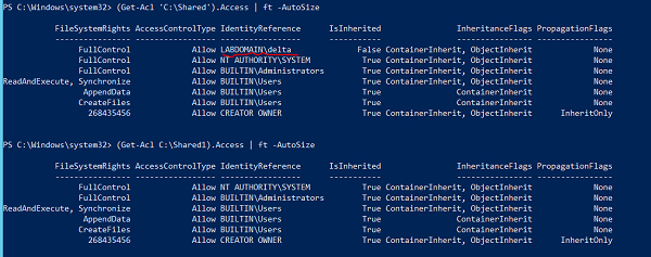 See the difference in the above security permissions, the Shared named folder has one additional permission assigned (LABDOMAIN\Delta). We will copy the permission from one folder to another using Get-ACL of the source and Set-ACL to the destination path using the pipeline.