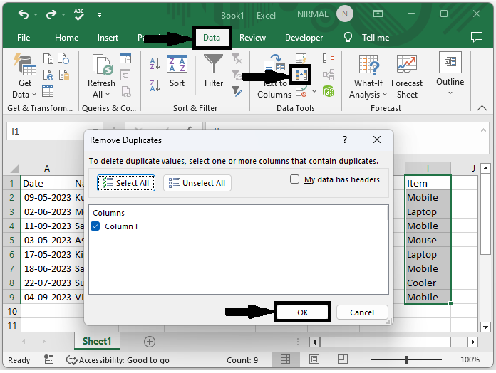 Then select the range of cells and click on "Data," then click "Remove Duplicates" and click OK.