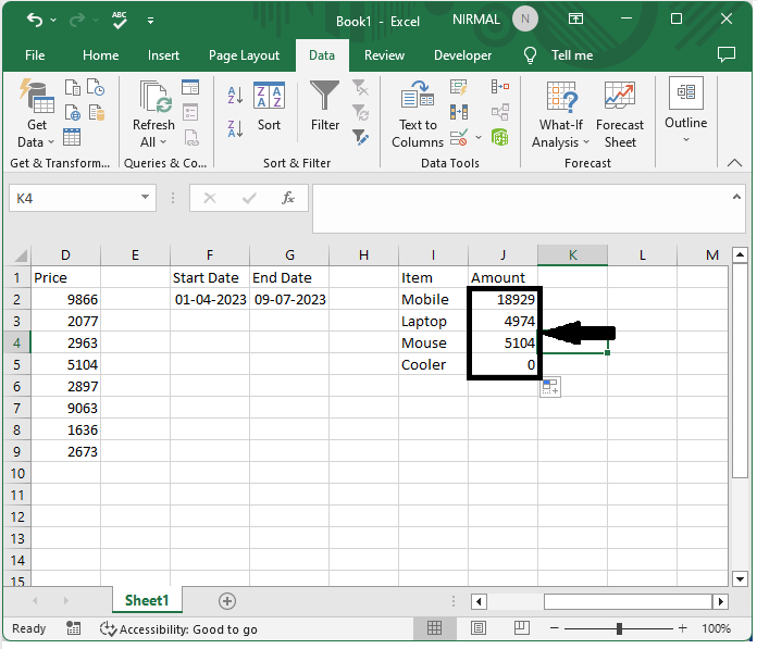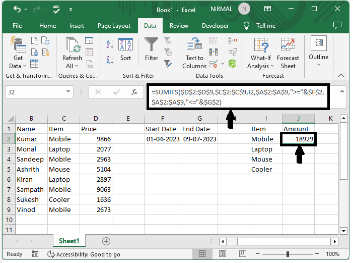 Now click on an empty cell in our case cell J2 and enter the formula as =SUMIFS($D$2:$D$9,$C$2:$C$9,I2,$A$2:$A$9,">="&$F$2,$A$2:$A$9,"<="&$G$2) and click enter to get the first value.