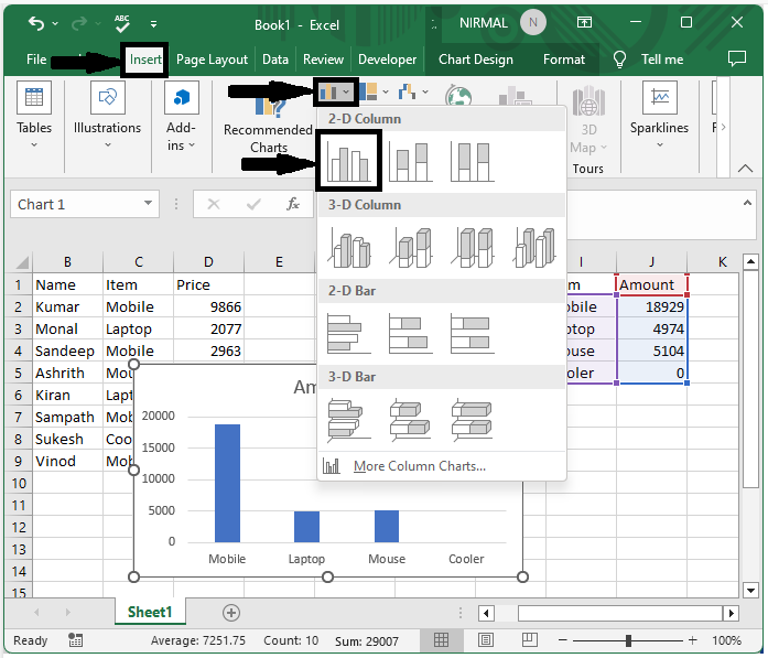 Now finally select the range of cells, click on insert, and select any chart to complete our task