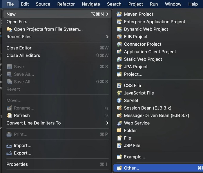 Step1− Click on the File menu in Eclipse. Then select the option New. Next click on Other
