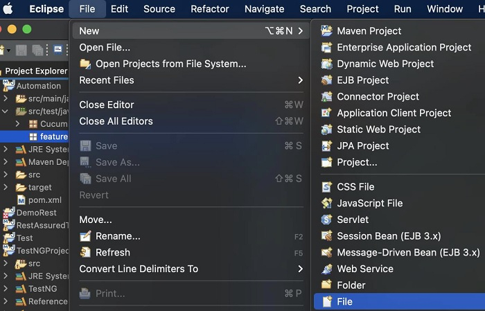 Step7− Create a feature file within the features package. Select the features package, then click on the File menu. Select option New->File.