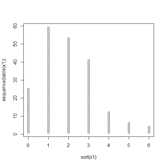 > x1<-rpois(200,2) > plot(sort(x1),sequence(table(x1)))