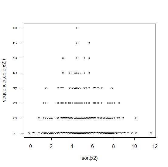 > x2<-round(rnorm(200,5,2),1) > plot(sort(x2),sequence(table(x2)))
