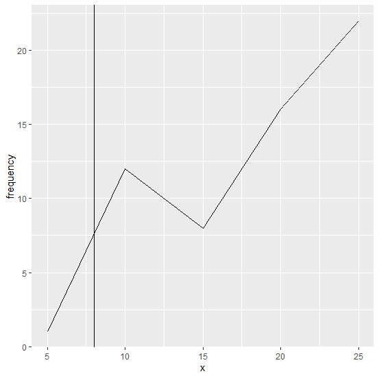 ggplot(df,aes(x,frequency,group=1))+geom_line()+geom_vline(xintercept=8)