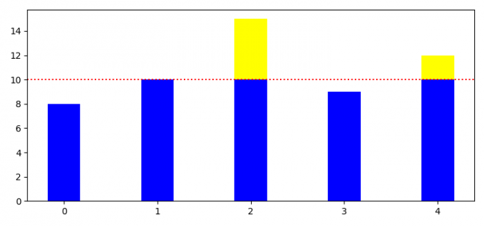import numpy as np import matplotlib.pyplot as plt plt.rcParams["figure.figsize"] = [7.50, 3.50] plt.rcParams["figure.autolayout"] = True threshold = 10 values = np.array([8.0, 10.0, 15.0, 9.0, 12.0]) x = range(len(values)) a_threshold = np.maximum(values - threshold, 0) b_threshold = np.minimum(values, threshold) fig, ax = plt.subplots() ax.bar(x, b_threshold, 0.35, color="blue") ax.bar(x, a_threshold, 0.35, color="yellow", bottom=b_threshold) plt.axhline(threshold, color='red', ls='dotted') plt.show()