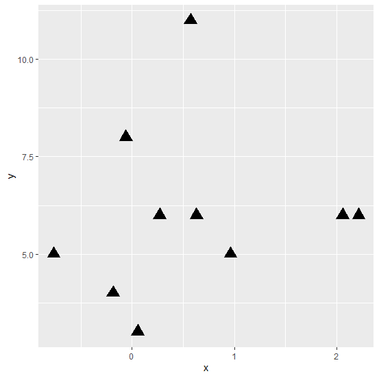 ggplot(df,aes(x,y))+geom_point(pch=17,size=5)