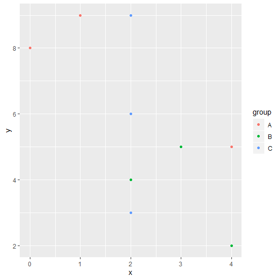 ggplot(df,aes(x,y,colour=group))+geom_point()
