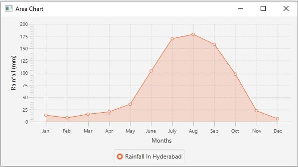 The area chart accepts a series of data points (x, y) as input values, connects them using a line, and maps the area between the obtained line and the axis. In JavaFX, you can create an area chart by instantiating the javafx.scene.chart.AreaChart class.