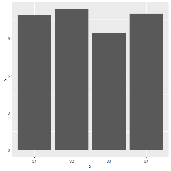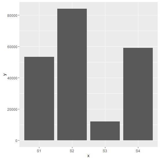 > library(ggplot2) > ggplot(df,aes(x,y))+geom_bar(stat="identity")