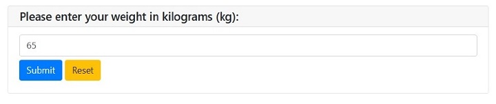 Now enter your weight in kilograms and again click the "Submit" button. Upon clicking the "Submit" button, it will show the result as below ?