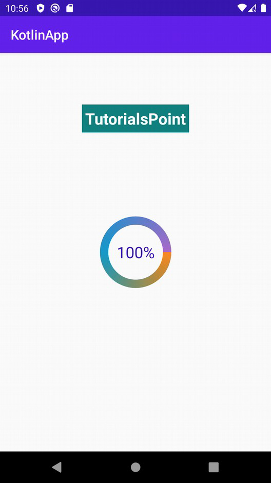 <?xml version="1.0" encoding="utf-8"?> <RelativeLayout xmlns:android="http://schemas.android.com/apk/res/android" xmlns:tools="http://schemas.android.com/tools" android:layout_width="match_parent" android:layout_height="match_parent" android:padding="8dp" tools:context=".MainActivity"> <TextView android:layout_width="wrap_content" android:layout_height="wrap_content" android:layout_centerHorizontal="true" android:layout_marginTop="70dp" android:background="#008080" android:padding="5dp" android:text="TutorialsPoint" android:textColor="#fff" android:textSize="24sp" android:textStyle="bold" /> <ProgressBar android:id="@+id/circularProgressbar" style="?android:attr/progressBarStyleHorizontal" android:layout_width="250dp" android:layout_height="250dp" android:layout_centerInParent="true" android:indeterminate="false" android:max="100" android:progress="50" android:secondaryProgress="100" /> <TextView android:id="@+id/textView" android:layout_width="250dp" android:layout_height="250dp" android:layout_centerInParent="true" android:gravity="center" android:text="25%" android:textColor="@color/colorPrimaryDark" android:textSize="24sp" /> </RelativeLayout>