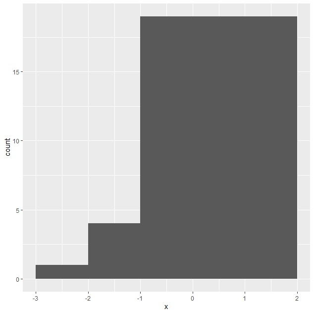 x<-rnorm(25) df<-data.frame(x) library(ggplot2) ggplot(df,aes(x))+geom_histogram(breaks=c(-3,-2,-1,2))
