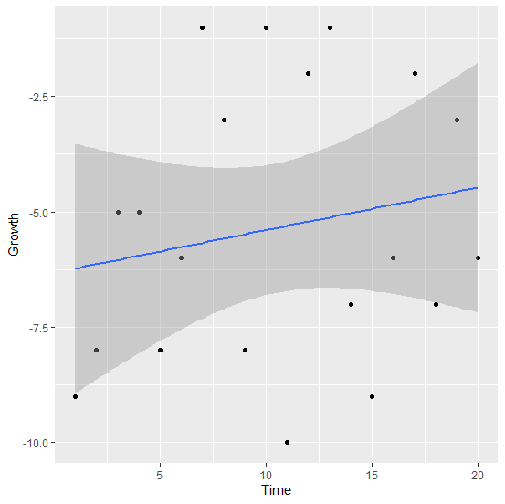 ggplot(df_growthstudy,aes(Time,Growth))+geom_point()+geom_smooth(method="lm") `geom_smooth()` using formula 'y ~ x'
