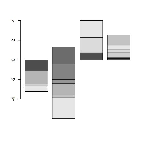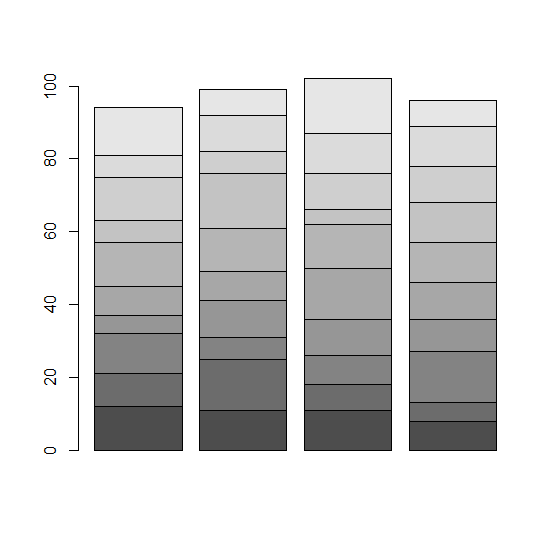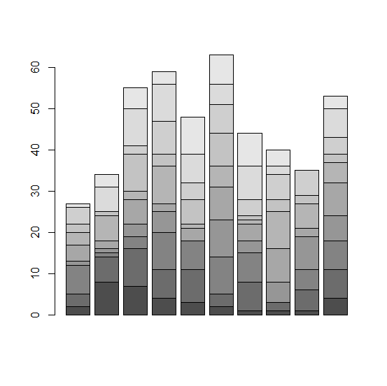 To create a stacked barplot using barplot function we need to use matrix instead of a data frame object because in R barplot function can be used for a vector or for a matrix only. We must be very careful if we want to create a stacked bar plot using barplot function because bar plots are created for count data only. Here, you will see some examples of count as well as continuous data, carefully read the graphs and understand how the graphs are different from each other.