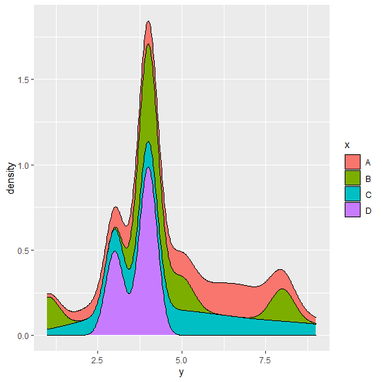 > library(ggplot2) > ggplot(df,aes(y,y=..density..))+geom_density(aes(fill=x),position="stack")