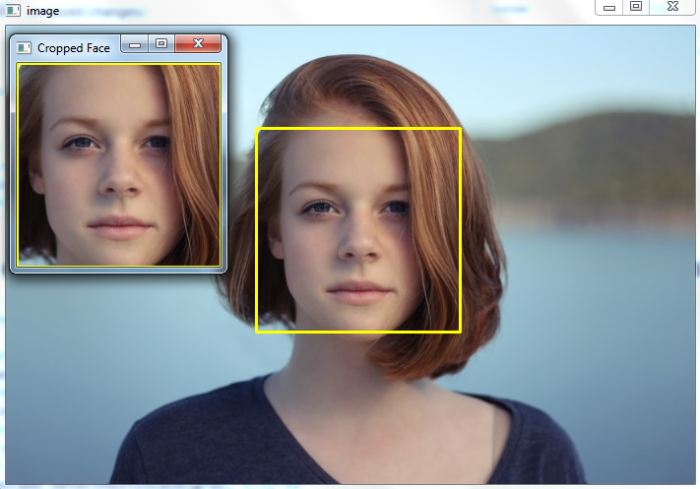 # import required libraries import cv2 # read the input image img = cv2.imread('woman.jpg') # convert to grayscale of each frames gray = cv2.cvtColor(img, cv2.COLOR_BGR2GRAY) # read the haarcascade to detect the faces in an image face_cascade = cv2.CascadeClassifier('haarcascades\haarcascade_frontalface_default.xml') # detects faces in the input image faces = face_cascade.detectMultiScale(gray, 1.3, 4) print('Number of detected faces:', len(faces)) # loop over all detected faces if len(faces) > 0: for i, (x, y, w, h) in enumerate(faces): # To draw a rectangle in a face cv2.rectangle(img, (x, y), (x + w, y + h), (0, 255, 255), 2) face = img[y:y + h, x:x + w] cv2.imshow("Cropped Face", face) cv2.imwrite(f'face{i}.jpg', face) print(f"face{i}.jpg is saved") # display the image with detected faces cv2.imshow("image", img) cv2.waitKey(0) cv2.destroyAllWindows()