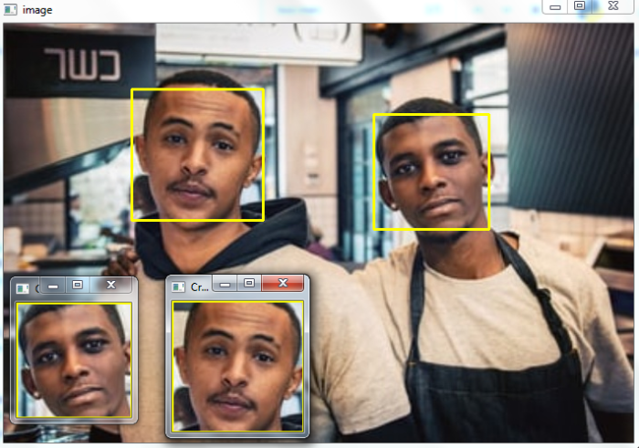# import required libraries import cv2 # read the input image img = cv2.imread('two-men.jpg') # convert to grayscale of each frames gray = cv2.cvtColor(img, cv2.COLOR_BGR2GRAY) # read the haarcascade to detect the faces in an image face_cascade = cv2.CascadeClassifier('haarcascades\haarcascade_frontalface_alt.xml') # detects faces in the input image faces = face_cascade.detectMultiScale(gray, 1.1, 4) print('Number of detected faces:', len(faces)) # loop over all detected faces if len(faces) > 0: for i, (x,y,w,h) in enumerate(faces): # To draw a rectangle in a face cv2.rectangle(img,(x,y),(x+w,y+h),(0,255,255),2) face = img[y:y+h, x:x+w] cv2.imshow(f"Cropped Face {i}", face) cv2.imwrite(f'face{i}.jpg', face) print(f"face{i}.jpg is saved") # display the image with detected faces cv2.imshow("image", img) cv2.waitKey(0) cv2.destroyAllWindows()