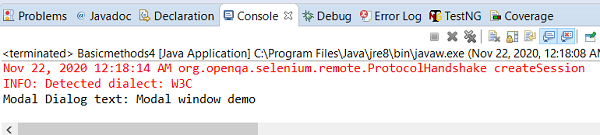 System.out.println("Modal Dialog text: " + m.getText());