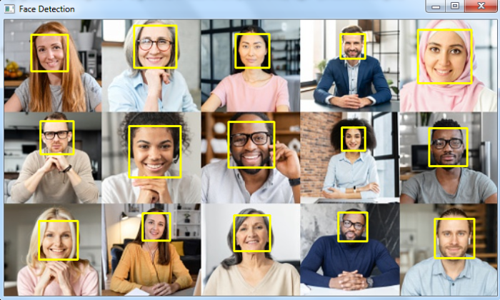 # import required library import cv2 # read the input image img = cv2.imread('people.jpg') # convert to grayscale of each frames gray = cv2.cvtColor(img, cv2.COLOR_BGR2GRAY) # read haacascade to detect faces in input image face_cascade = cv2.CascadeClassifier('haarcascades\haarcascade_frontalface_alt.xml') # detects faces in the input image faces = face_cascade.detectMultiScale(gray, 1.1, 2) print('Number of detected faces:', len(faces))\ # loop over all the detected faces for (x,y,w,h) in faces: # To draw a rectangle around the detected face cv2.rectangle(img,(x,y),(x+w,y+h),(0,255,255),2) # Display an image in a window cv2.imshow('Face Detection',img) cv2.waitKey(0) cv2.destroyAllWindows()