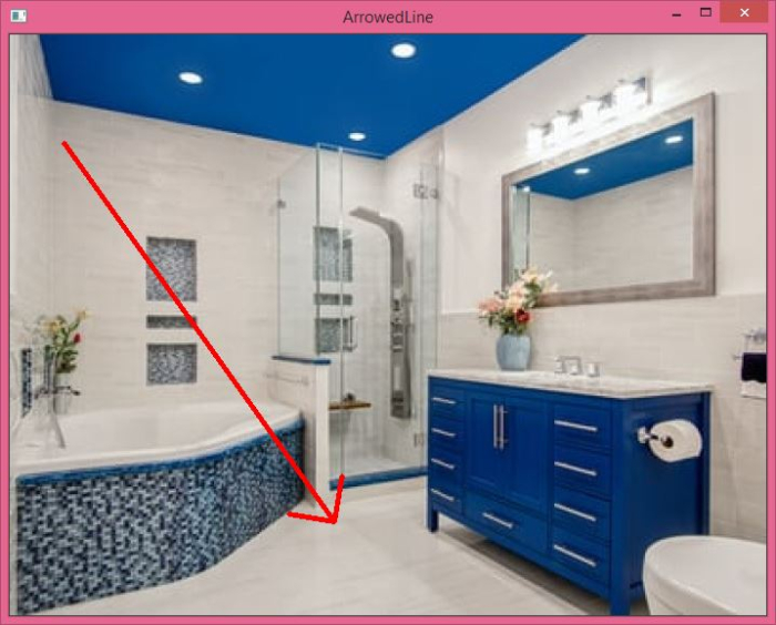import cv2 image=cv2.imread('cabinet.jpg') cv2.arrowedLine(image, (50, 50), (200, 150), (0,0,255), 3, 7, 0, 0.2) cv2.arrowedLine(image, (300, 120), (50, 320), (0,255,255), 3, 7, 0, 0.2) cv2.arrowedLine(image, (50, 200), (500, 400), (255,0,255), 3, 7, 0, 0.05) cv2.imshow("ArrowedLines",image) cv2.waitKey(0) cv2.destroyAllWindows()