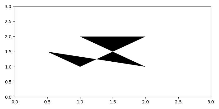 import numpy as np import matplotlib.pyplot as plt from matplotlib.patches import Polygon plt.rcParams["figure.figsize"] = [7.00, 3.50] plt.rcParams["figure.autolayout"] = True y = np.array([[1, 1], [0.5, 1.5], [2, 1], [1, 2], [2, 2]]) p = Polygon(y, facecolor='k') fig, ax = plt.subplots() ax.add_patch(p) ax.set_xlim([0, 3]) ax.set_ylim([0, 3]) plt.show()