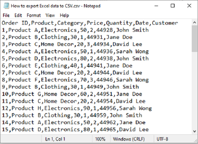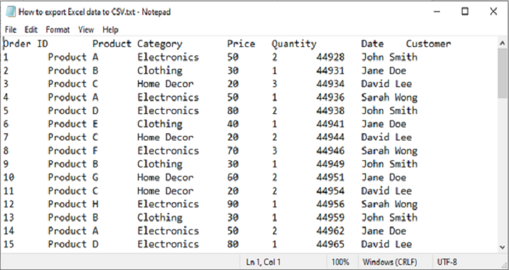 Step 4: The file will be saved in the CSV format. You can open it either with excel or notepad. Here I have opened the file in the notepad app, the data looks like as follows.