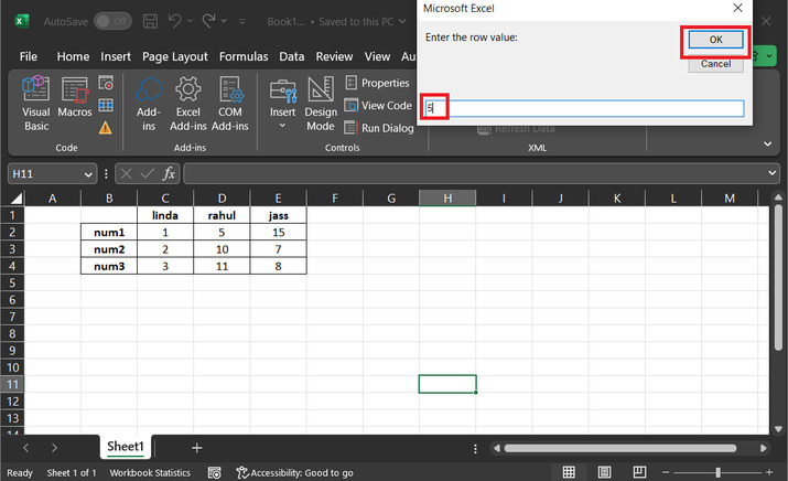 The above step will open the below-given code window. Here, the user needs to input the data value that needs to be searched inside the above-provided row number. In this example, will enter 5, to generate the required output results. Finally, click on the "OK" button. here, the user is searching number 5 in the 2nd row, if obtained column header will be displayed else an error message will be displayed.