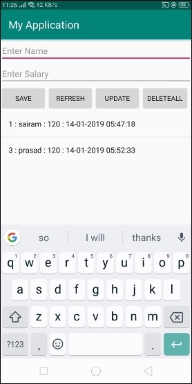 In the above code, we have taken name and salary as Edit text, when user click on save button it will store the data into sqlite data base. Click on refresh button to get the listview.