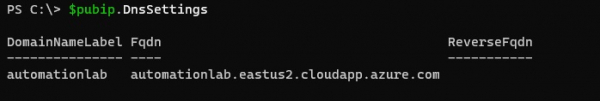 PS C:\> $pubip.DnsSettings.fqdn automationlab.eastus2.cloudapp.azure.com