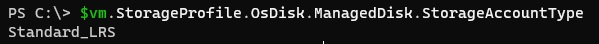 PS C:\> $vm = Get-AzVM -Name TestVM PS C:\> $vm.StorageProfile.OsDisk.ManagedDisk.StorageAccountType