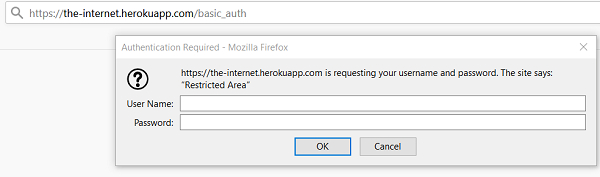 https://username:password@URL https://admin:admin@the−nternet.herokuapp.com/basic_auth Here, the admin is the username and password. URL − www.the-internet.herokuapp.com/basic_auth