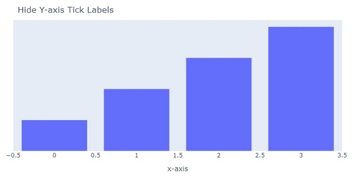 import plotly.graph_objects as go fig = go.Figure( data=[go.Bar(y=[10,20,30,40])], layout_title_text="Hide Y-axis Tick Labels", layout = { 'xaxis': {'title': 'x-axis', 'visible': True, 'showticklabels': True}, 'yaxis': {'title': 'y-axis', 'visible': False, 'showticklabels': False}, # specify margins in px 'margin': dict( l = 20, # left r = 15, # right t = 30, # top b = 40, # bottom ), }, ) fig.update_layout(width=716, height=350) fig.show()