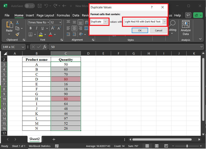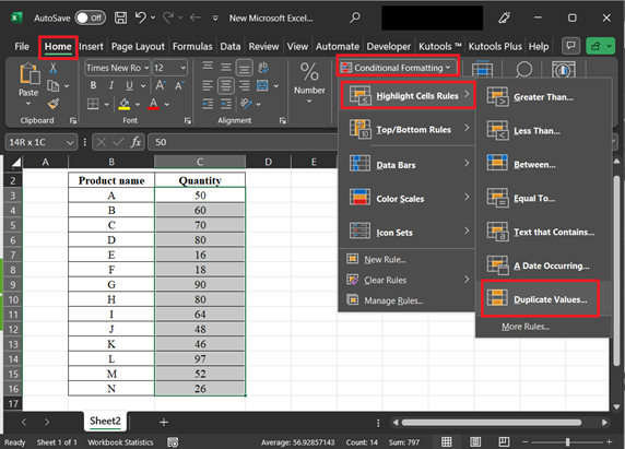 Before, moving further select the data where the user wants to find the duplicate values. Go to the "Home" tab, click on the "Conditional Formatting" option, and then select the "Highlight Cells Rules" option. Further, select the option "Duplicate Values". This step allows the user to determine the duplicate values. This simply means that the duplicate quantity values will be displayed as a result value in the final step. A snapshot for reference is provided below: