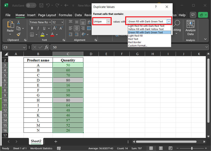Unique values are the ones that do not have any exact matching value in the Excel sheet. While the duplicate value is the one that has the same values available in the list. This article illustrates two common examples of the same. The first example allows the user to determine the duplicate value. In this example, all the duplicate values will be highlighted properly. While the second example allows the user to determine the unique values available in the specified data range.