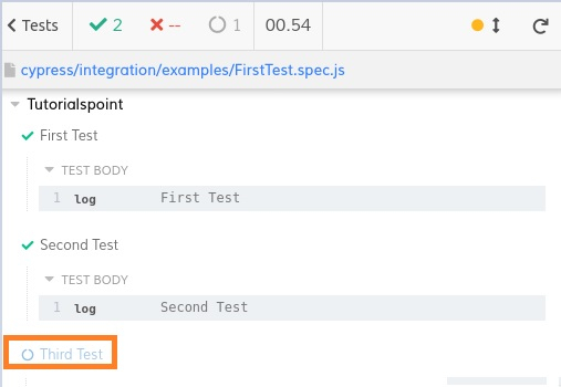 The output logs show that the it block (Third Test) with the .skip tag got skipped from the execution.