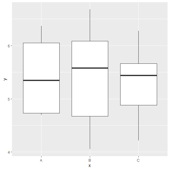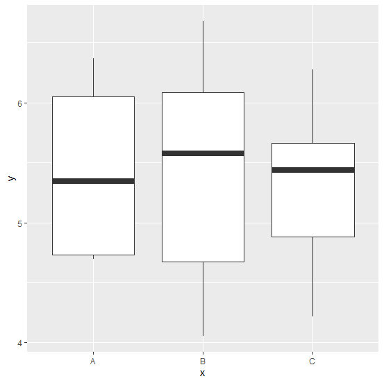 ggplot(df,aes(x,y))+geom_boxplot(fatten=3)s