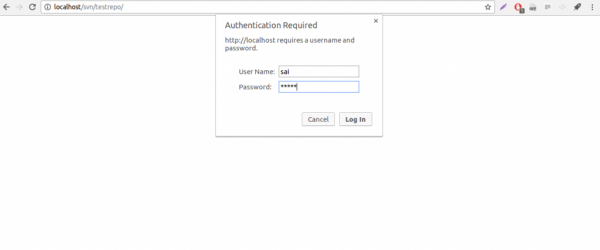 <Location /svn> DAV svn SVNParentPath /svn/repos/ AuthType Basic AuthName "Tutorials Point" AuthUserFile /etc/svnpasswd Require valid-user </Location>
