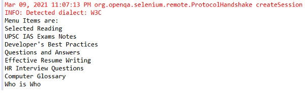 First, we have to identify the element with ul tag with any locator, then traverse through its li sub-elements with the help of a loop. Finally, use the method getText to obtain the text on the li elements.
