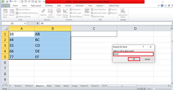 In the visual basic window, place the cursor in the ribbon and click on the Run icon to run this code that will open the dialog box in the active worksheet. Select all the cells or two columns which you want to merge the columns. Click on the Run tab then it will return to the sheet. In the sheet, it opens the pop-up window to ask to select two columns. In the pop-up window, select the range from A1 to B5 then click on the ok button that will open the pop-up window. In the window, select any cell where we have to merge the columns into one column. It will merge the two columns into one as shown below.