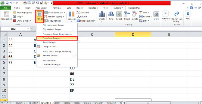 In the sheet, place the cursor in the ribbon. In the ribbon, there are many tabs included in the top corner. Place the cursor in the Ku-tools tab and click on the tab that has many options included. On the Ku-tools tab, place the cursor and click on the Range tab which has a drop-down menu on the Ranges & Cells group. Click on the menu and select the Transform Range tab as shown below ?