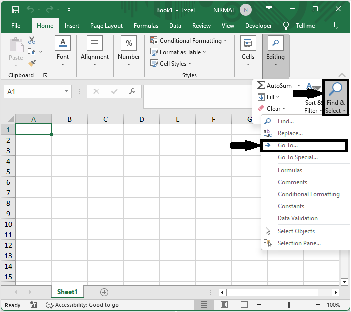 First, click Find and Select under Home, select Go To...