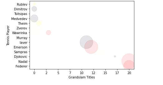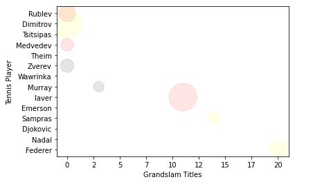 5. Ohh, my GrandSlam titles plotted on x-axis is a float. I will convert them to integer and also add a title for x-axis and y-axis in below function. The axis formatter will be overwritten with .set_major_formatter.