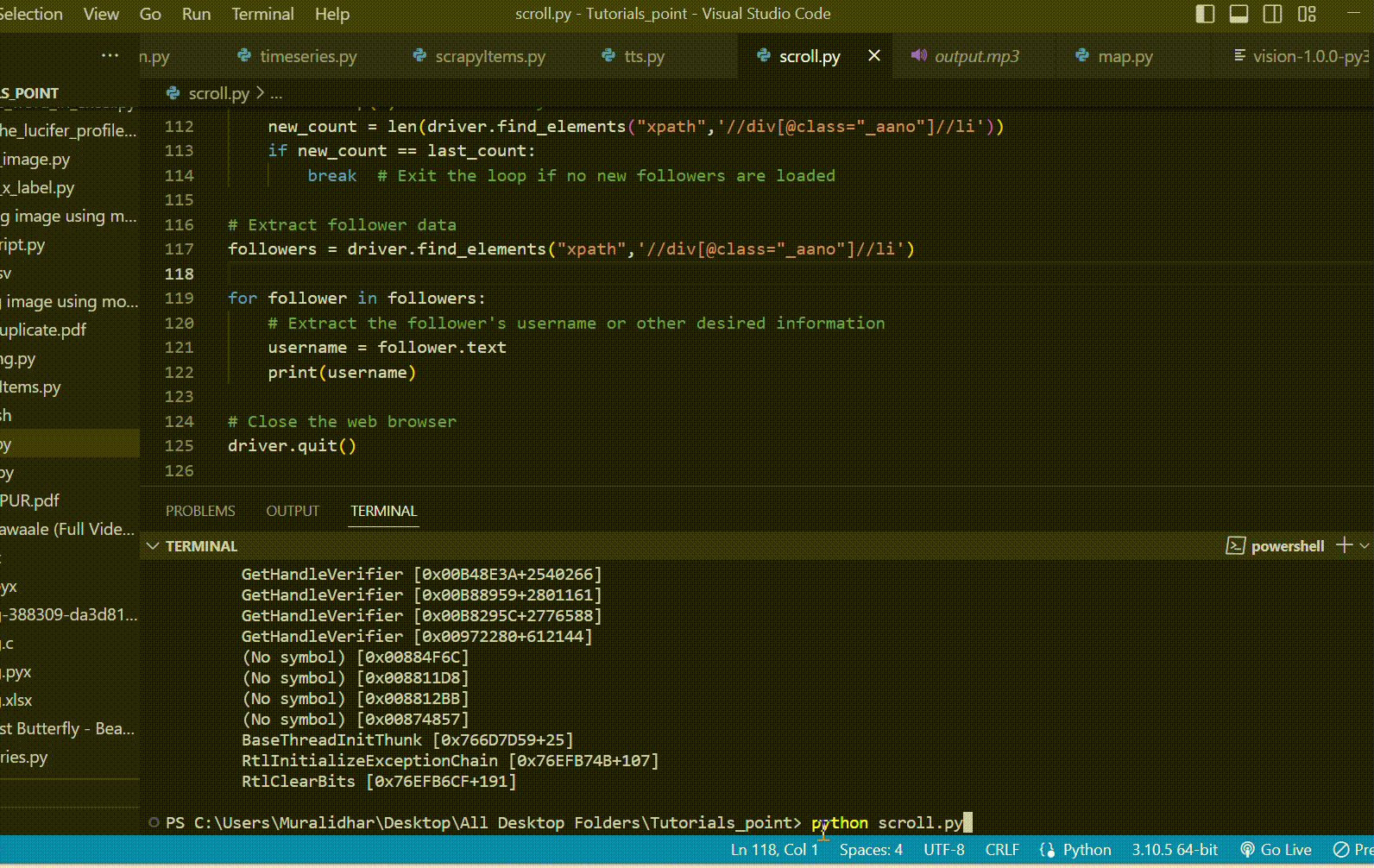 Step 9: Scrolling Down the Followers Popup:Define a JavaScript script to scroll the followers popup to the bottom. The script sets the scrollTop property of the element to its scrollHeight, which scrolls it to the maximum height. We use a while loop to repeatedly execute the scrolling script until no new followers are loaded. Inside the loop, we keep track of the number of followers before and after scrolling. If the number of followers remains the same, it means no new followers were loaded, and we break out of the loop.