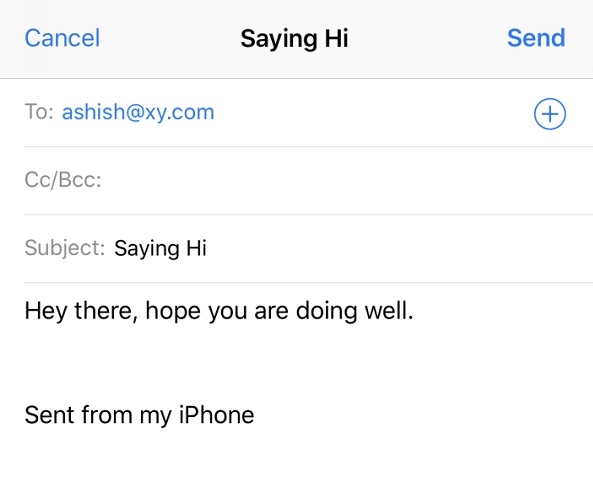 composeEmail(to: "ashish@xy.com", subject: "Saying Hi", Body: "Hey there, hope you are doing well.")