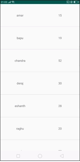 <?xml version="1.0" encoding="utf-8"?> <LinearLayout xmlns:android="http://schemas.android.com/apk/res/android" android:orientation="horizontal" android:layout_width="match_parent" android:weightSum="1" android:layout_height="wrap_content"> <TextView android:id="@+id/name" android:layout_width="0dp" android:layout_weight="0.5" android:gravity="center" android:textSize="15sp" android:layout_height="100dp" /> <TextView android:id="@+id/age" android:layout_width="0dp" android:layout_weight="0.5" android:gravity="center" android:textSize="15sp" android:layout_height="100dp" /> </LinearLayout>